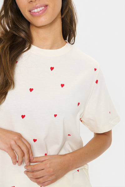 This fun cream cotton T-shirt with small red heart print. Relaxed fit with crew neck and short sleeves.